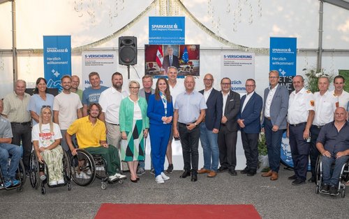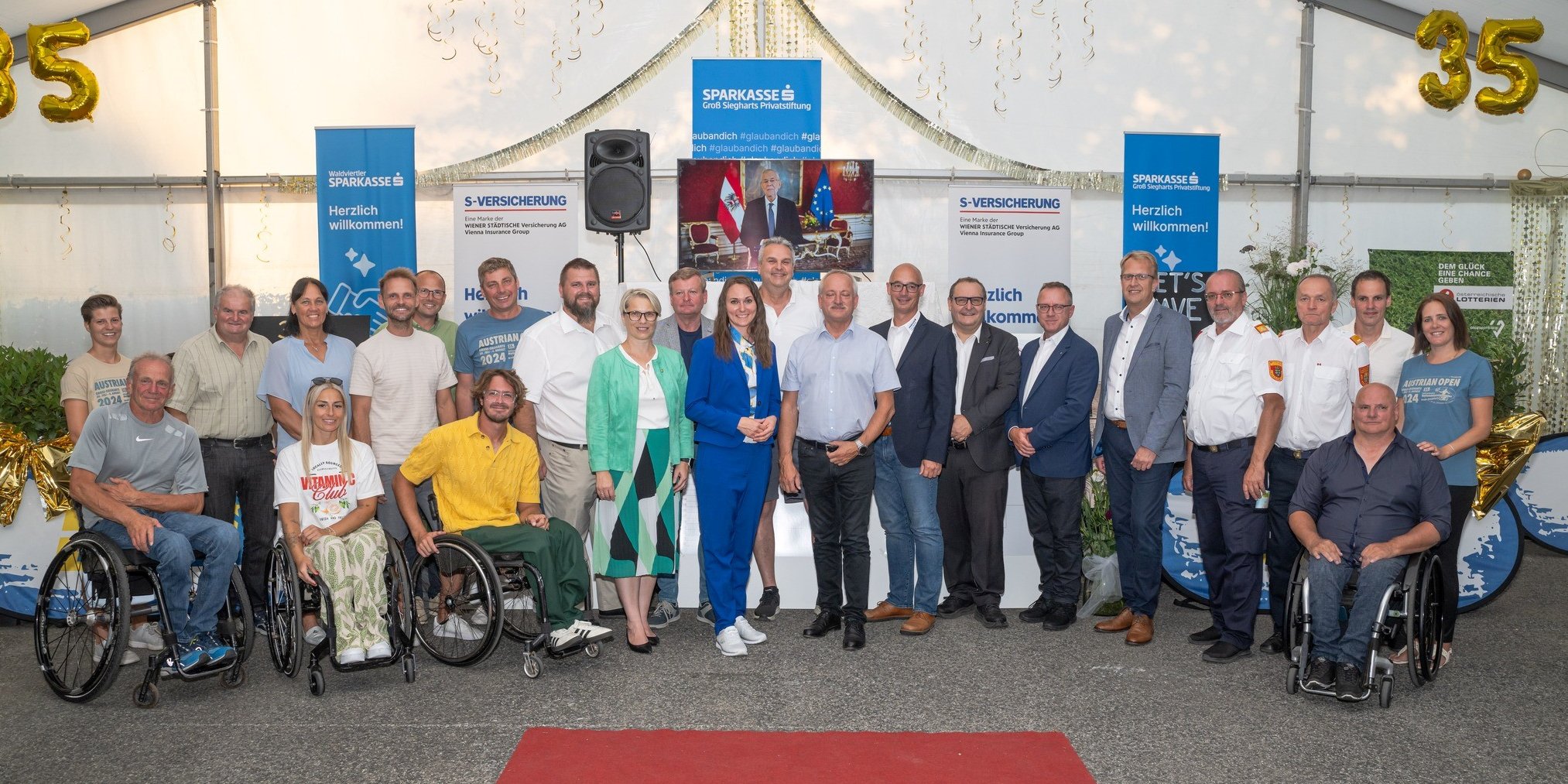 Von links nach rechts: Turnierdirektorin Viola Lugmayr, Rollstuhltennislegende Martin Legner, TC-Aigen-Obmann Franz Piffl, NÖTV-Präsidentin Petra Schwarz, Staatsmeisterin Christina Pesendorfer, ÖTV-Inklusionsleiter Stefan Schuh, TC.Groß-Siegharts Obmann Dr. Andreas Hauer, Österreichs Nummer 1 Nico Langmann, Stadtrat Andreas Peschel, Vizebürgermeister Michael Litschauer, Bezirkshauptfrau Mag. Manuela Herzog, Landtagsvizepräsident Gottfried Waldhäusl, Bundesrätin Viktoria Hutter, Bürgermeister Ulrich Achleitner, s Versicherung Landesdirektor Alois Maurer, Vorsitzender des Vorstands der Sparkasse Groß-Siegharts Privatstiftung Christian Reegen, Filialdirektor Waldviertler Sparkasse Bank AG Harald Moldaschl, Regionaldirektor Waldviertler Sparkasse Bank AG Martin Bogg, Vorsitzender des Vorstands Stv. der Waldviertler Sparkasse Bank AG Dipl. Kfm. (FH) Peter Hochleitner, Bezirksfeuerwehrkommandant Manfred Damberger, Bezirksfeuerwehrkommandant Stv. Kurt Liball, Turnierdirektor Philipp Dörre, Austrian-Open-Legende Kurt Blaha, Turnierdirektorin Gisela Pfandler.