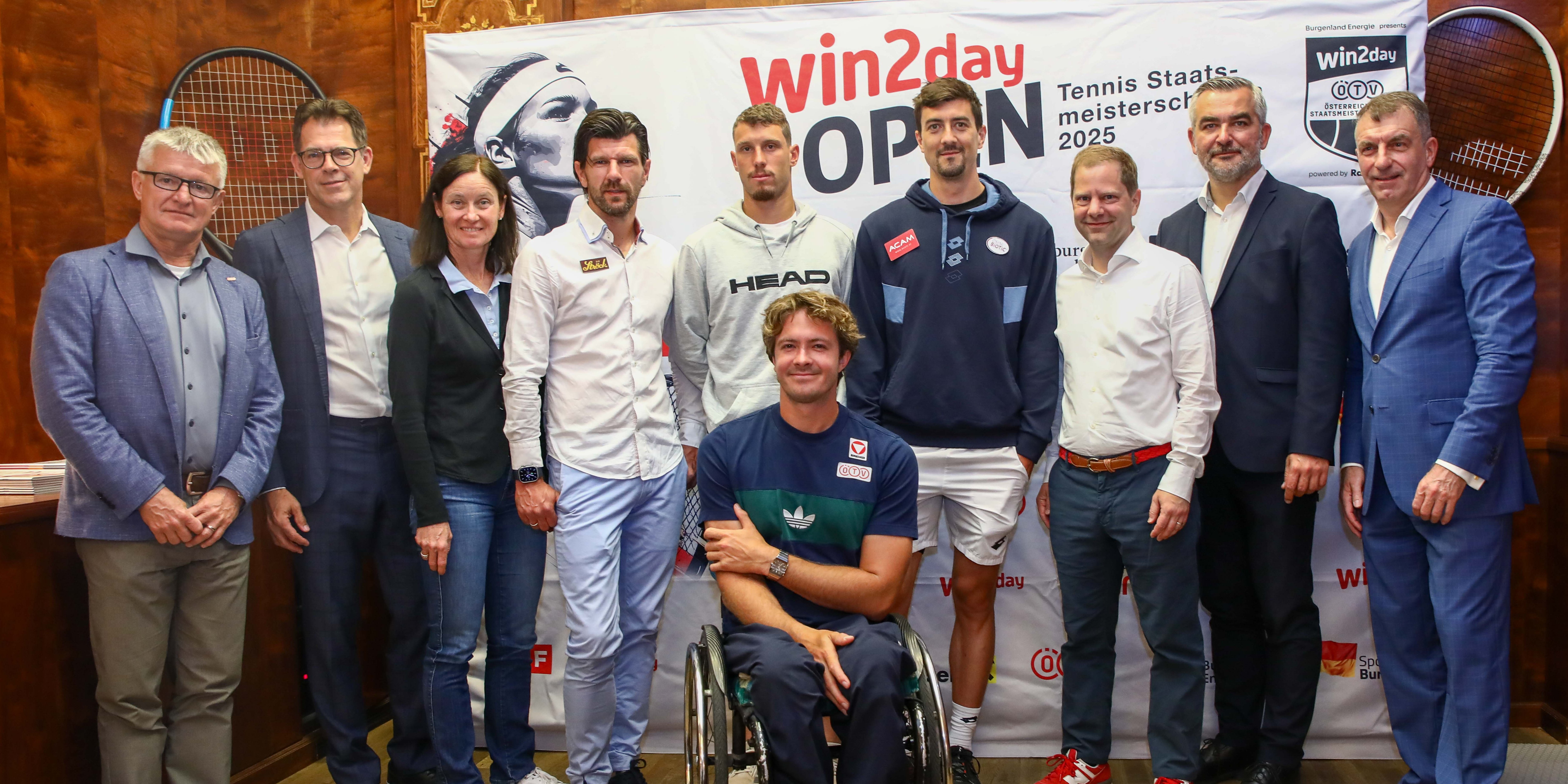 Bei einer Pressekonferenz im Café Landtmann in Wien von links nach rechts: Thomas Schweda (ÖTV-Geschäftsführer Wirtschaft), Georg Blumauer (ÖTV-Vizepräsident), Marion Maruska (ÖTV-Sportkoordinatorin und -Billie-Jean-King-Cup-Kapitänin), Jürgen Melzer (ÖTV-Sportdirektor und -Davis-Cup-Kapitän), Titelverteidiger Filip Misolic, Rollstuhltennis-Titelverteidiger Nico Langmann, Sebastian Ofner, Georg Wawer (Managing Director win2day), Mag. Heinrich Dorner (Sportlandesrat Burgenland), Günter Kurz (BTV-Präsident, Veranstalter).