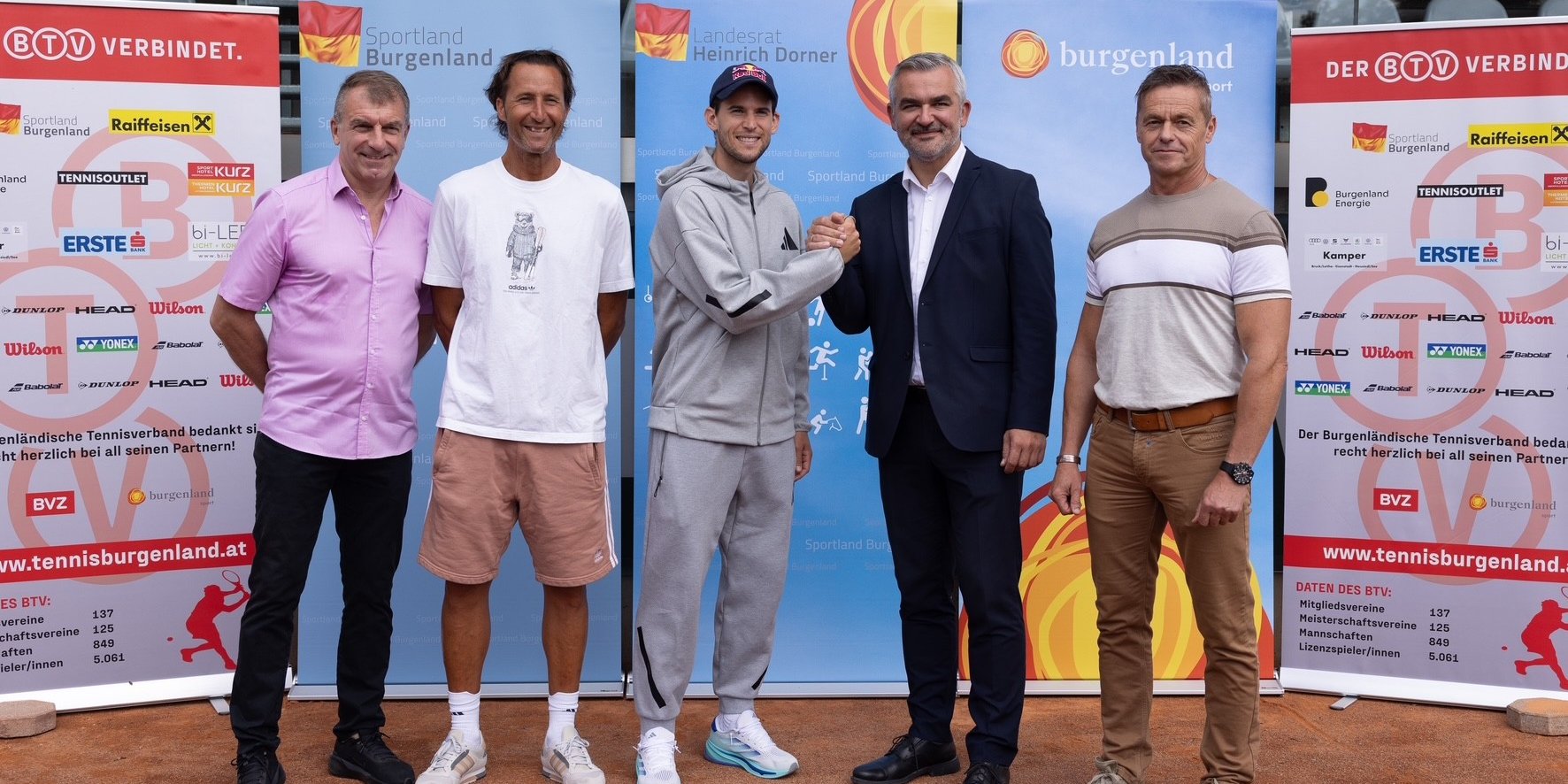Seit seinem Rücktritt bei den Erste Bank Open in der Wiener Stadthalle im Oktober 2024 greift Dominic Thiem wettbewerbsmäßig nur noch hin und wieder zum Tennisracket und setzt sich speziell für die Themen Nachhaltigkeit und Umweltschutz ein. Am Donnerstag hat der US-Open-Gewinner von 2020 nun aber neue, weitere Pläne zu seinen Aktivitäten nach seiner so erfolgreichen Karriere als Tennisprofi präsentiert. Der Niederösterreicher wird in Hinkunft Partner der Tennisakademie Burgenland in Oberpullendorf, die in Thiem Academy Burgenland umbenannt werden soll. Das gab der 31-Jährige höchstpersönlich bei einem Medientermin auf dem Stützpunkt der Academy im Sporthotel Kurz bekannt – gemeinsam mit Hausherr und BTV-Präsident Günter Kurz, Burgenlands Sportlandesrat Mag. Heinrich Dorner, Anton Beretzki (Geschäftsführer der Sport Burgenland GmbH) und nicht zuletzt seinem Vater Wolfgang Thiem, dem Leiter der Tennisakademie Burgenland. „Mich freut es ungemein, dass wir die Kooperation ausweiten. Ich werde mich jetzt noch viel mehr einbringen – weil ich den Kindern der neuen Generation einfach sehr, sehr viel von dem, was ich in meiner Karriere erfahren habe, zurückgeben will“, erklärte Thiem in seinem Statement. Seine Erfahrungen seien „das Allerwichtigste“, daher wolle er sich in erster Linie als Mentor und Unterstützer des heimischen Tennisnachwuchses anbieten, weniger als Trainer – auch wenn er jungen Toptalenten wie Thilo Behrmann zudem auch als Trainingspartner zur Verfügung stehen wolle.