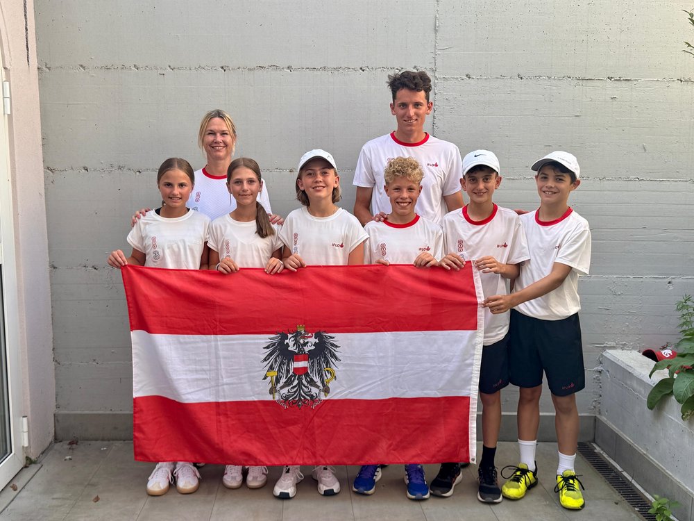 Österreichs U12-Teams bei der Lampo Trophy. Vorne von links nach rechts: Nina Buchegger, Elisa Freudenthaler, Lina Jacob, Lennard Wala, Jonas Mittermayr, Sebastian Schöls. Hinten von links nach rechts: Ex-WTA-Profi Petra Russegger, ÖTV-U12-Nationaltrainer Dominik Hutterer.