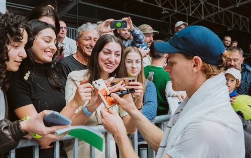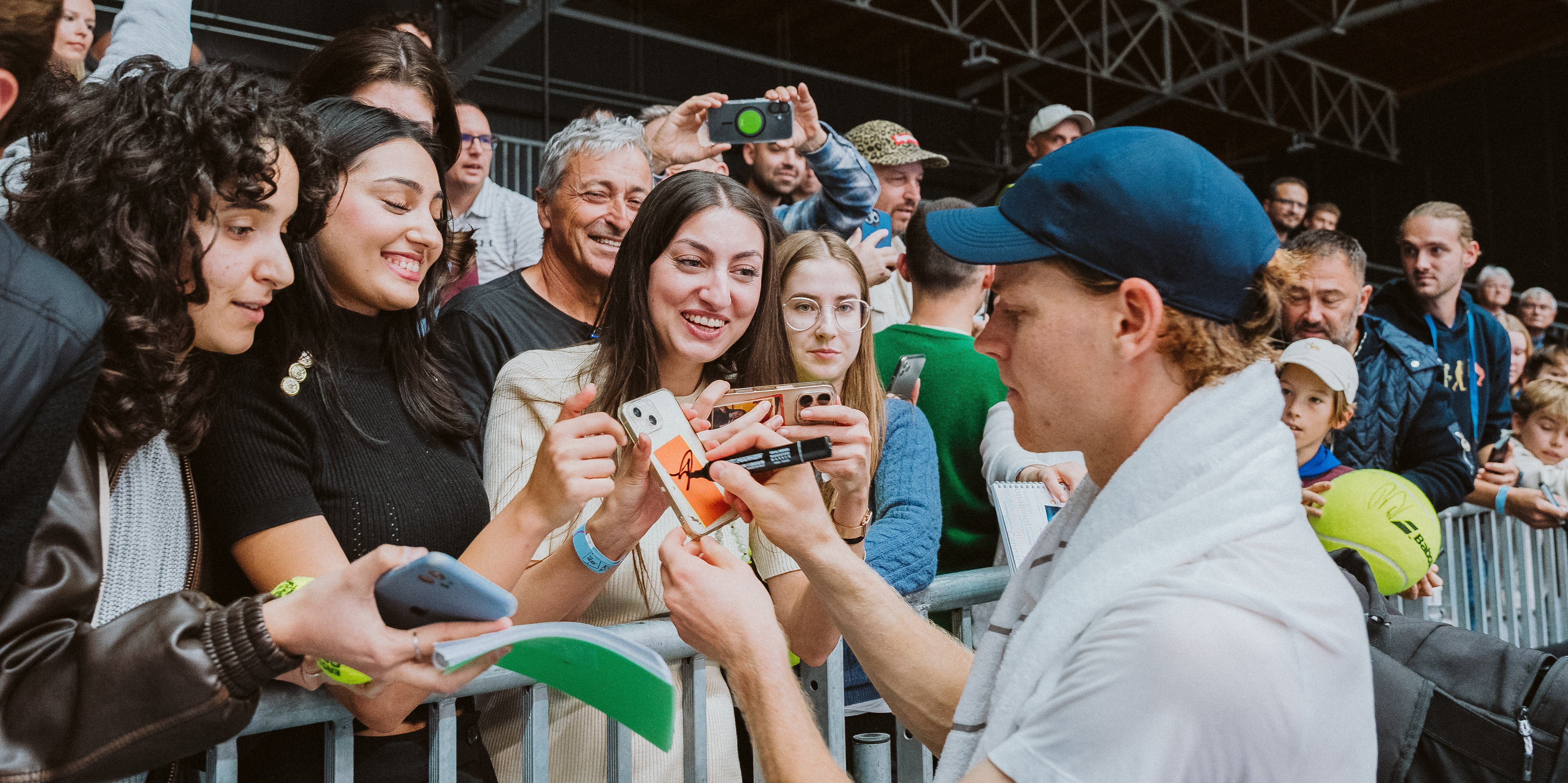 Bei der ersten Übungseinheit von Jannik Sinner in Wien am frühen Montagnachmittag in der Marx Halle war die zweite Matchlocation der Erste Bank Open gut gefüllt. Nach dem zweistündigen Training schrieb der italienische Publikumsliebling sehr zur Freude seiner großen Fangemeinde bereitwillig Autogramme und posierte auch für Selfies.