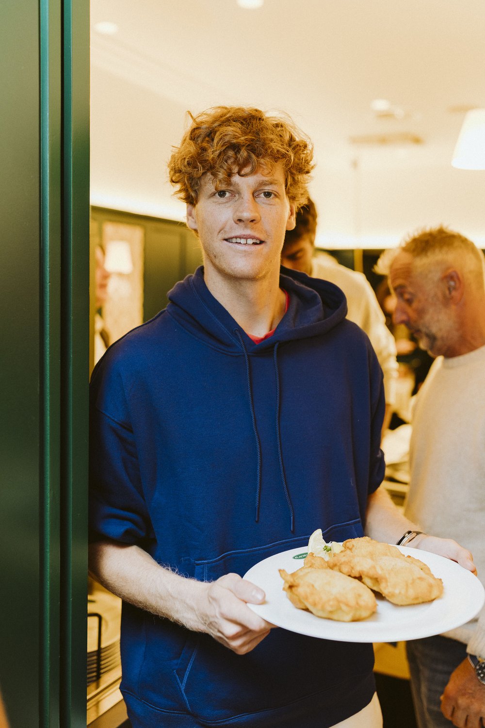 Jannik Sinner (links) mit seinem Schnitzel – und Thomas Muster (rechts) im Hintergrund als strenger Begutachter.